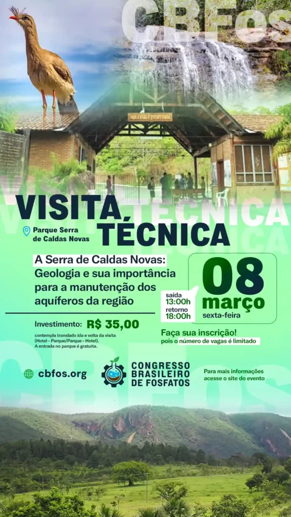 Será realizada no dia 08/03/2024 uma visita técnica pós-congresso nas instalações do Parque Estadual da Serra de Caldas Novas (PESCAN). O campo será realizado pelas Geólogas Cibele Tunussi e Mariarosa Fernandes de Sousa e consistirá em caminhada pelas trilhas do parque estadual. A Serra de Caldas possui altitude que varia de 700 a 1000 metros e sendo uma área de preservação ambiental há ocorrência de Cerrado Rupestre, vegetação nativa, típica de Cerrado, além de cachoeiras sustentadas em rochas que poderão ser observadas e desfrutadas durante a visita. A estrutura geológica da Serra, junto com o tipo de solo e rochas associados possuem significativa importância hidrogeológica, sendo a principal área de recarga para os aquíferos termais da região.